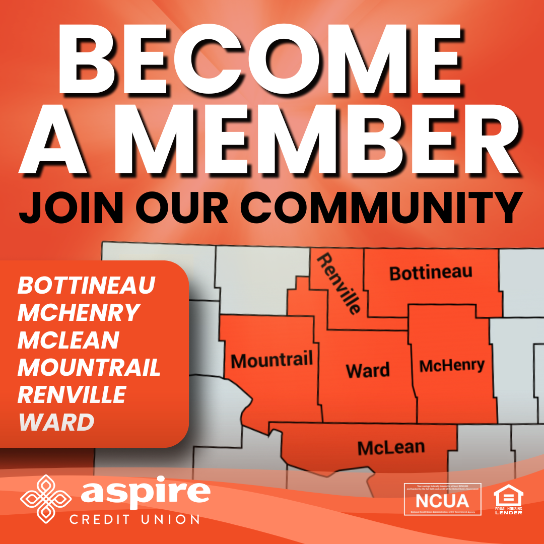 Aspire is a community-chartered credit union whose field of membership includes: anyone who lives, works, worships, or attends school; and businesses, other legal entities, and organizations of such persons; located in : Bottineau, McHenry, McLean, Mountrail, Renville, or Ward counties of North Dakota. Our membership also includes immediate families or households of our existing members.